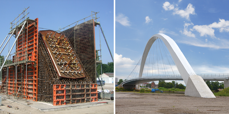 PASCHAL's solutions were also in demand for a very special bridge: the connection between Germany and France near Kehl. A new 160-metre-long steel arch bridge was built for the extension of the Strasbourg tram to Kehl station. The construction company GTM-HALLE used the modular formwork and LOGO.3 formwork systems for both the bridge foundations of Pont Citadelle and for the two abutments.