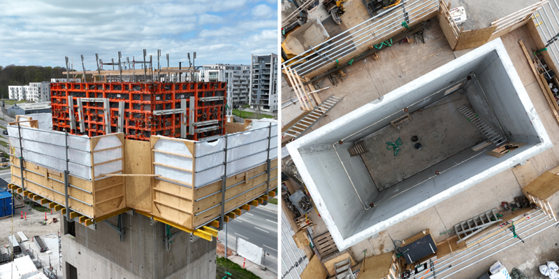 WoodHUB in Odense, Denmark – Paschal's wall formwork system, LOGO.pro, and climbing bracket 240 were used for the stairwells and shafts. With their help, the tower 'grows' upwards together with the formwork.