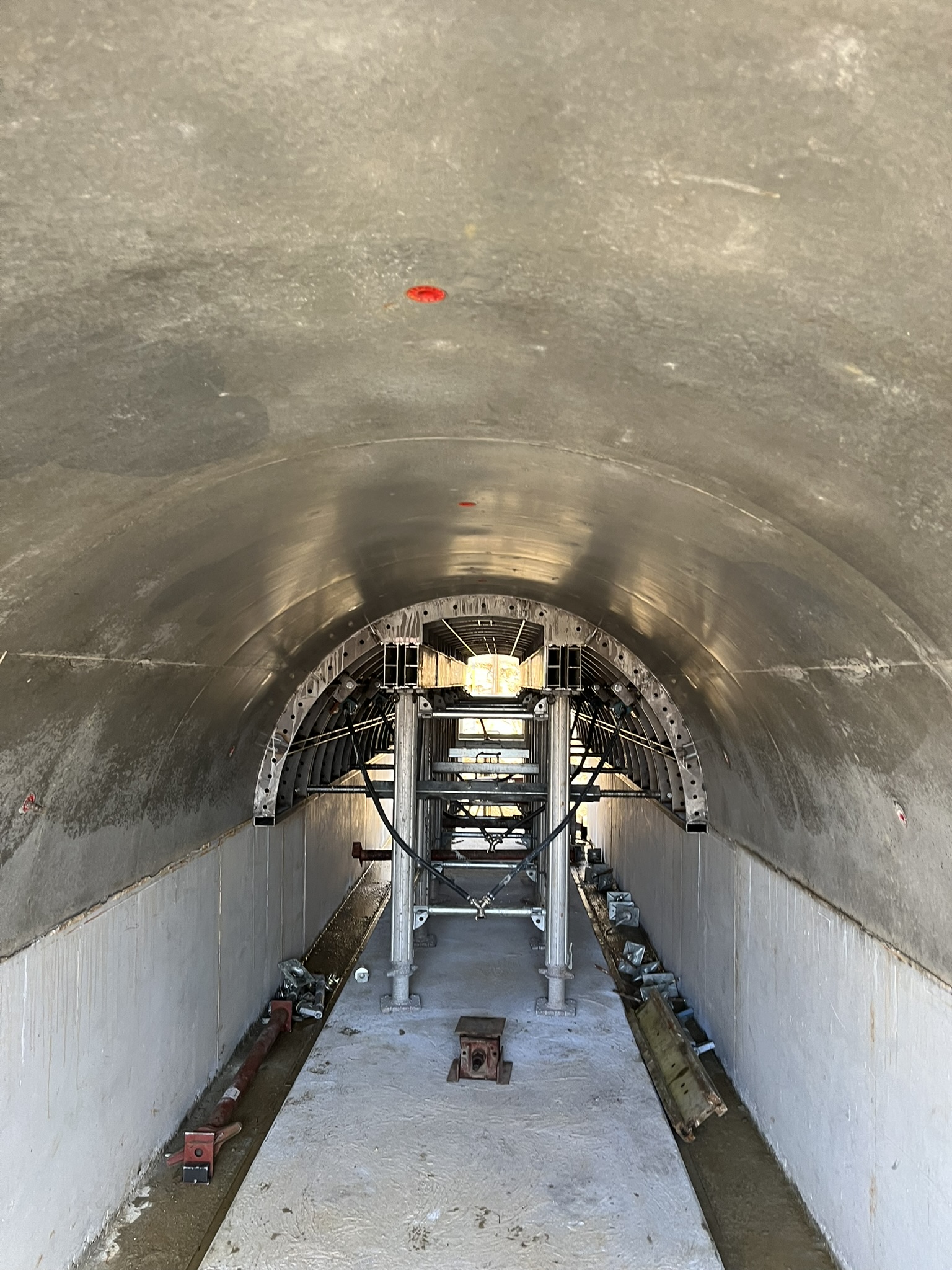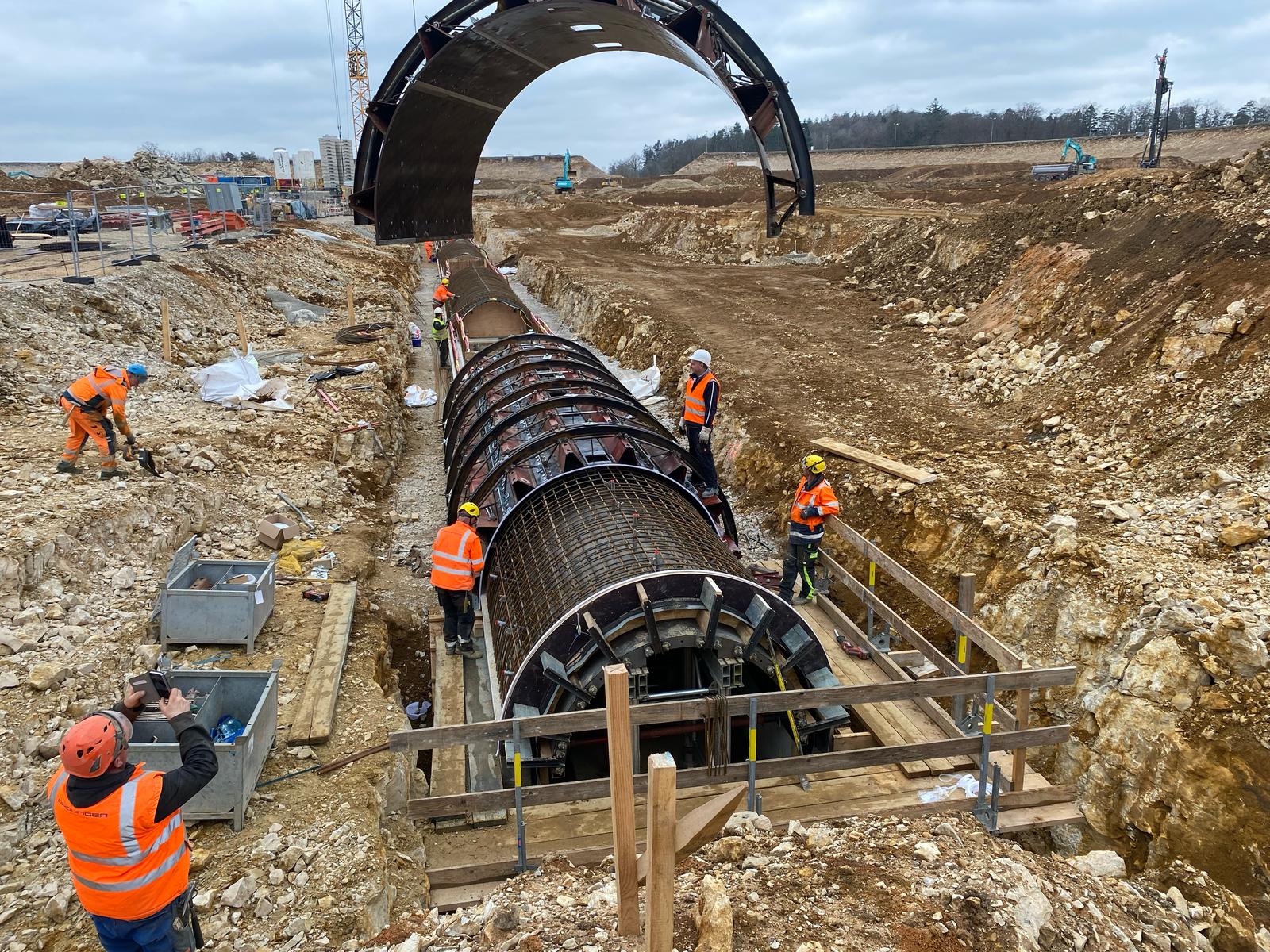 Après le coulage de la dalle de fondation, les parois latérales de 1,00 mètre de haut ont suivi. L'arc semicirculaire du tunnel, d'un diamètre de 2,20 mètres, constitue la dernière étape. Tous les éléments de construction ont une épaisseur de 40 cm. Le coffrage intérieur a été conçu comme un coffrage spécial en acier avec des articulations afin de faciliter le décoffrage et l'abaissement. L'étaiement GASS avec des éléments de série a été utilisé comme sous-construction, tout comme le coffrage circulaire à poutres trapézoïdales pour l'extérieur.