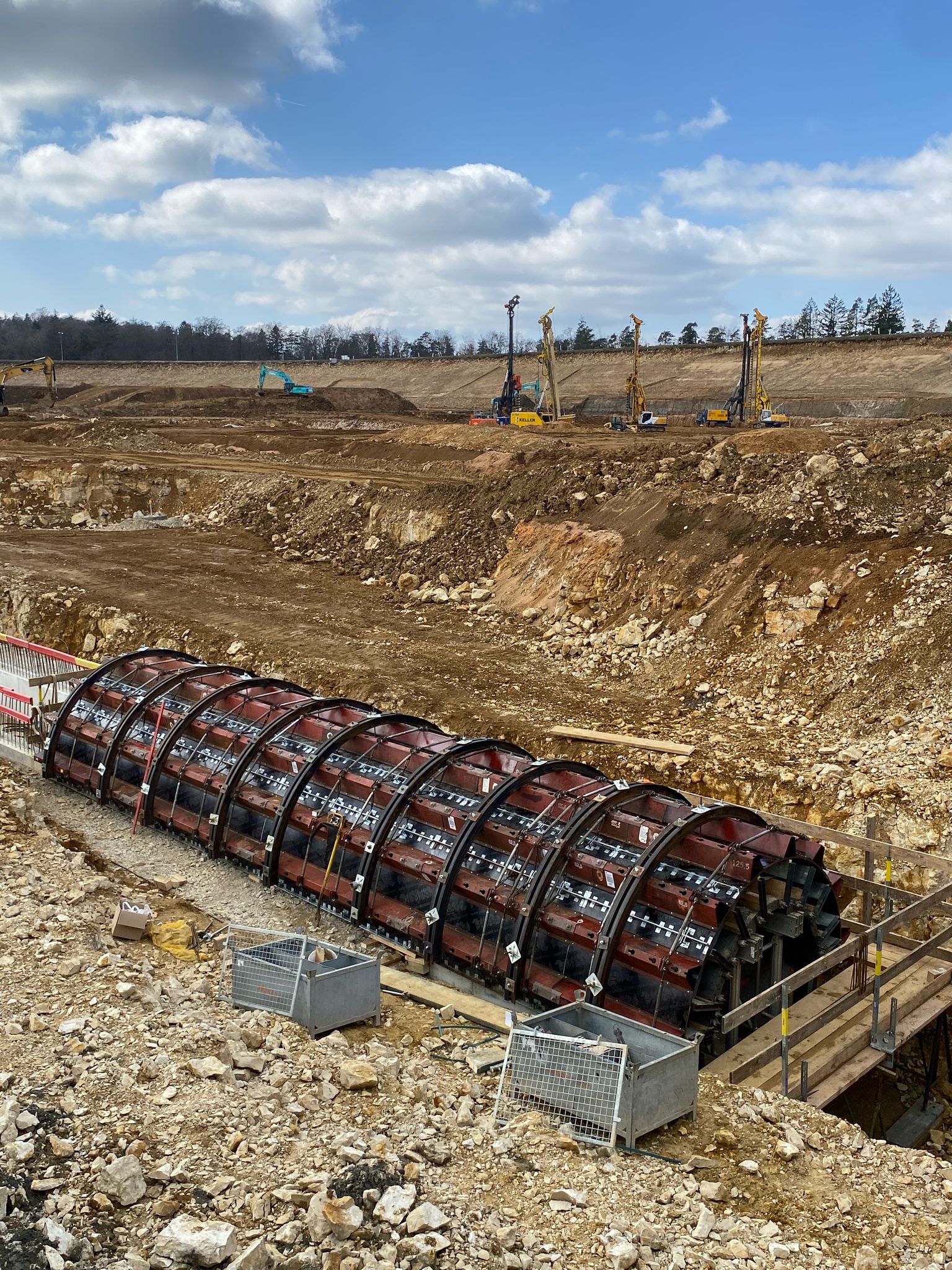 Dans le cadre de cet immense chantier, un couloir de contrôle de 530 mètres de long en béton coulé sur place est aussi en cours de construction sous le bassin complet, selon la méthode de construction de tunnels à ciel ouvert. Le fabricant de coffrages PASCHAL, basé à Steinach, a fourni le coffrage et l'étaiement pour le soutien de la structure. Les travaux ont débuté en décembre 2024 et devraient s'achever en mars 2026.