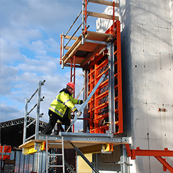L'installation pour coffrage grimpant 200 cm constitue notre système complet standard pour un coffrage grimpant sûr et efficace. Les unités grimpantes sont constituées de consoles pignons (fixes ou de type coulissant), de planches, de garde-corps, d'étais pour stabiliser le coffrage et éventuellement d'une passerelle de ragréage.